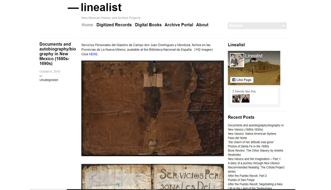 The Linealist explores the history of New Mexican families, culture and ancestry. The project curates archival documents in the Digitized Records page, and offers research links in the Archive Portal. To illustrate the connections between and amongst New Mexican and Nueva Viscayan families, the Matrilineal and Patrilineal pages address the ancestral lines of the children of Elijio Chavez and Carmen Fierro.